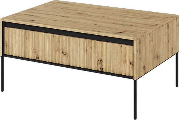 Soffbord av laminerad spånskiva med ben av metall. Förvaringsutrymme under bordsskivan. Levereras omonterad.