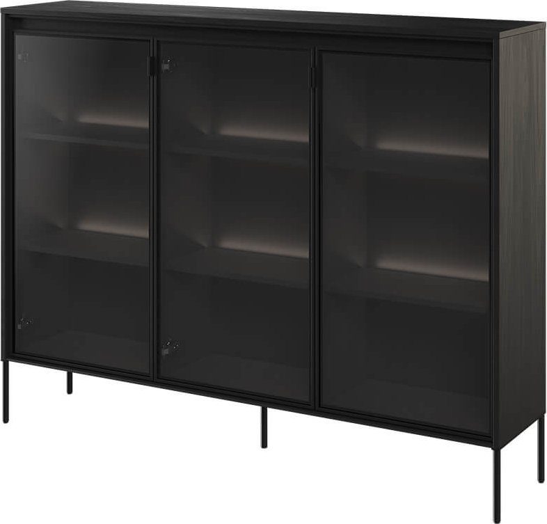 Vitrinskåp av laminerad spånskiva med LED-belysning, glasdörrar och ben av metall. Levereras omonterad.