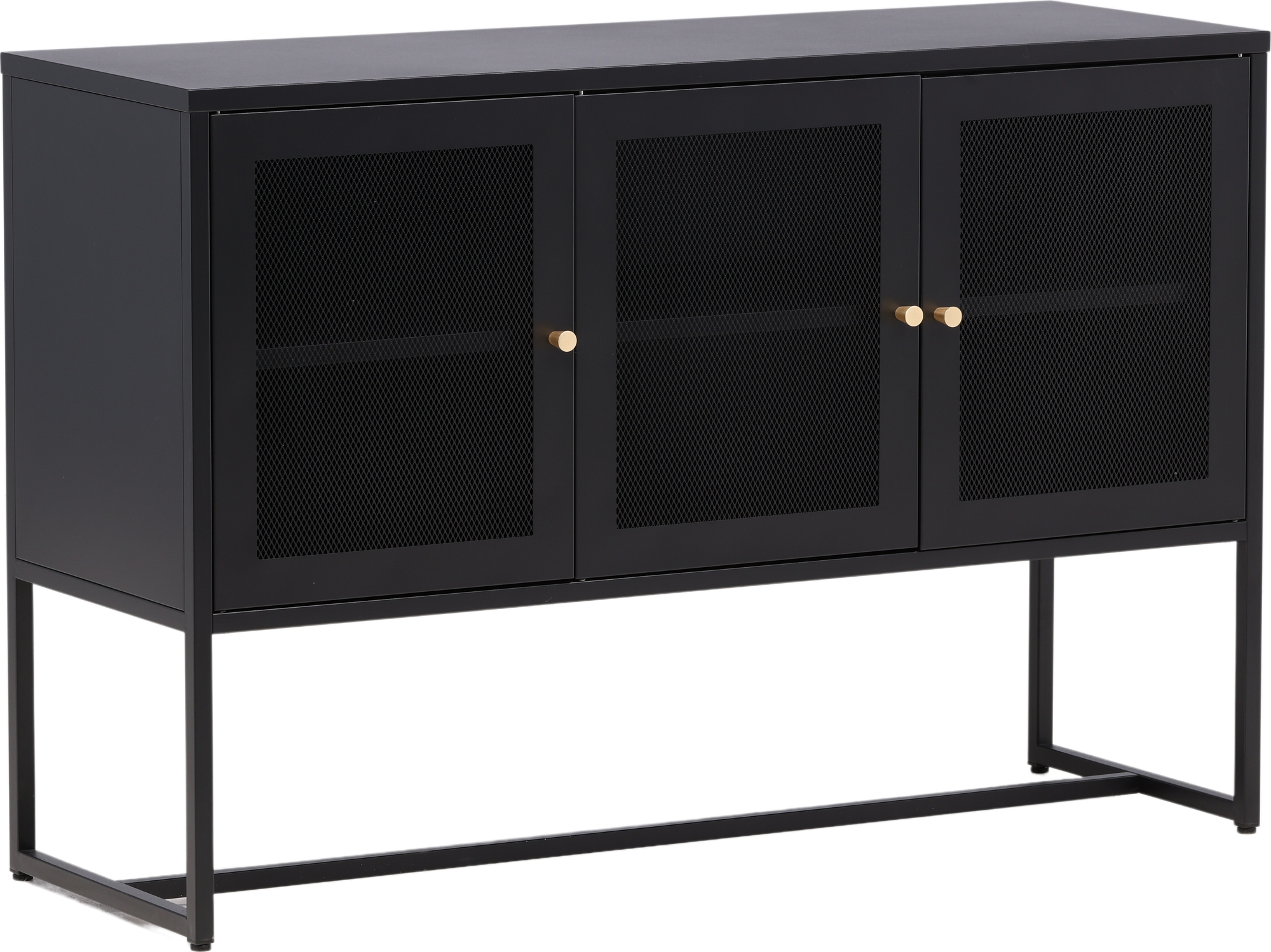 Trerike - ett modernt skåp i en tuff industriell design med läckra nätdörrar och ben tillverkade i svart pulverlackerad stål med 2 smarta hyllplan för avlastning. Skåpet lyfts upp av smala, höga ben som skapar en luftig känsla och underlättar även för dammsugaren. Den perfekta förvaringsmöbeln för allt du önskar - fyll med porslin, böcker eller vackra dekorationer. Skåpets smidiga storlek och eleganta utsida gör den lättplacerad och passar bra in i de flesta rum i hemmet, så möblera efter egna behov och önskemål.