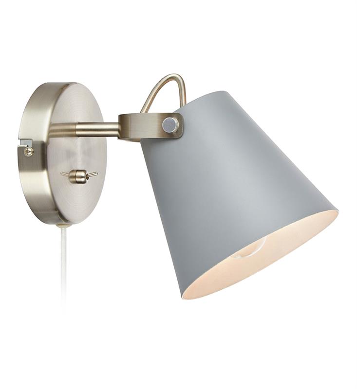 Tribe stilren vägglampa. Bas och skärm tillverkade i metall. Upphängning med hjälp av U-bygel. Ansluts till väggkontakt och med inbyggd strömbrytare i basen. (E14) lamphållare för max 40W ljuskälla.