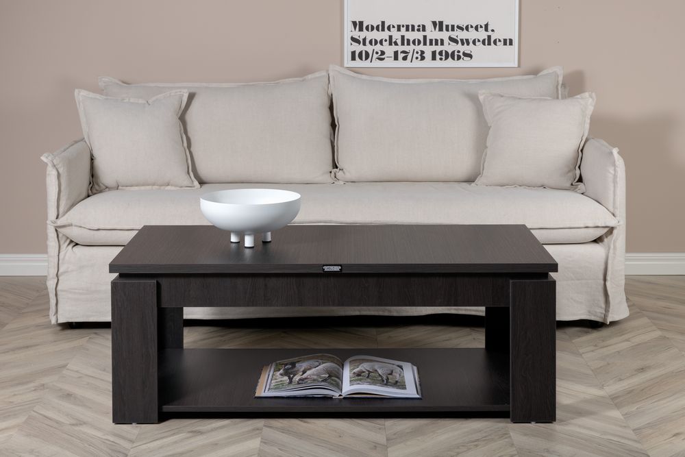 Soffbord i rektangulär form, med underhylla. Tillverkat av mörkbrun spånskiva. Stilrent, perfekt till vardagsrummet.