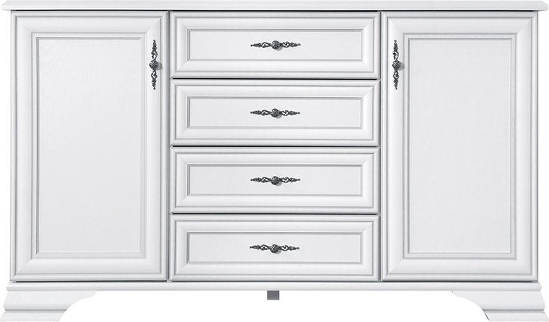 Ett fint sideboard i vitt med metallhandtag. Sideboardet har två skåp och fyra lådor som ger många förvaringsmöjligheter. Med de dekorativa handtagen i metall och de fina detaljerna på dörrarna och benen blir möbeln ett klassisk inslag i din inredning.