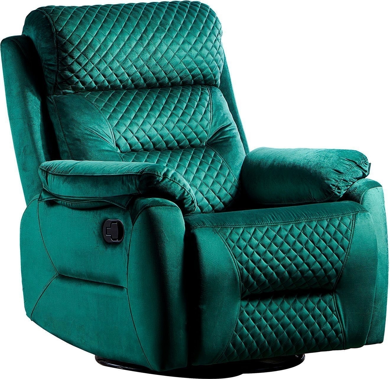 Reclinerfåtölj av trä, klädd med tyg. Manuell reclinermekanism.
