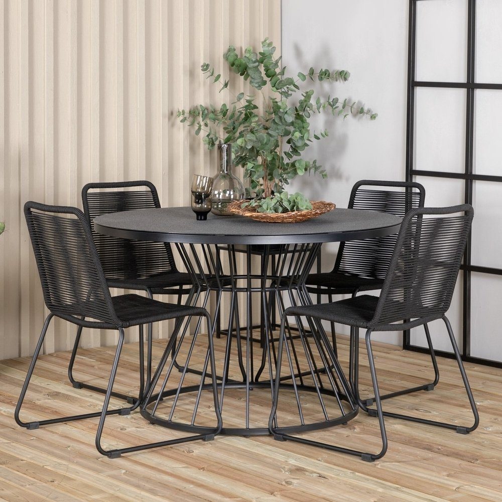 Möblera uteplatsen modernt och praktiskt! Här kombineras dekorativa matstolar i svart rep från serien Lindos med det runda matbordet Tropea. Den smakfulla designen på bordsbenen ger en liten extra exklusiv känsla till rummet. Här kan ni samla vänner och familj för trivsamma måltider i sommar!