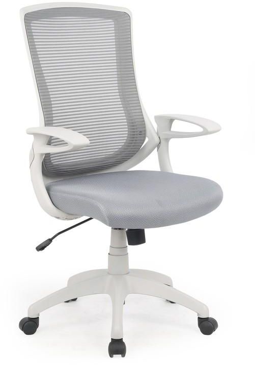 Stilren kontorsstol med en stilren design. Tillverkad i vitmålad metall och plast, med en bekväm sits i grått tyg och ryggstöd i nät. Höj- och sänkbar sits och lätt att förflytta tack vare hjulen på stjärnfoten.