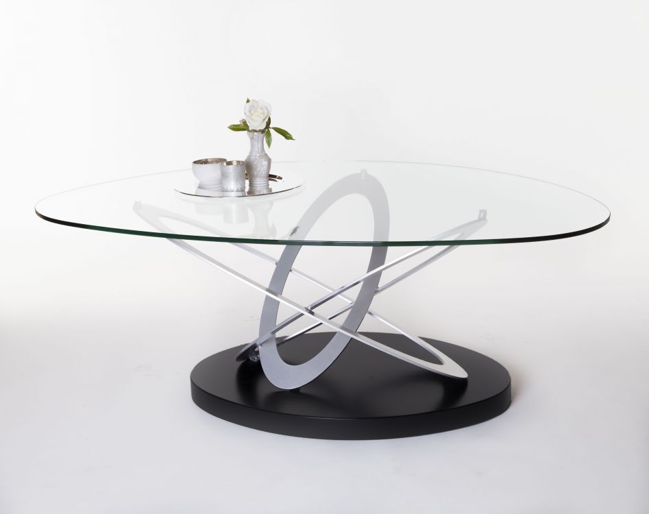 Ett lite annorlunda soffbord med kromade ringar som ben och bordsskiva i transparent glas.