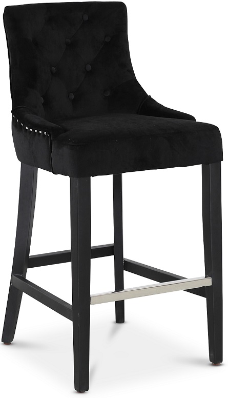 Tuva barstol med exklusivt kromat handtag i ryggen och matchande kromade nitar som en snygg decoration på det svarta sammetstyget. Svarta massiva träben. En skön och sittvänlig barstol. Knappar på insidan av ryggen och en metallbar på fotstödet.