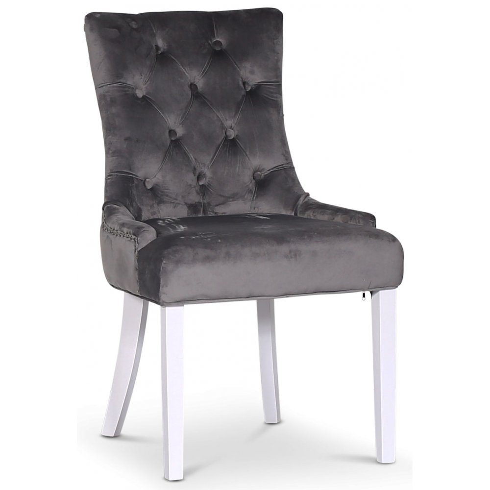 Tuva Decotique stol klädd i ett mjukt och lent sammetsliknande grått tyg med vitlackade ben. Stolen pryds av kromade nitarna som en snygg detalj! Stolen är välarbetad och en av våra mest populära matstolar.