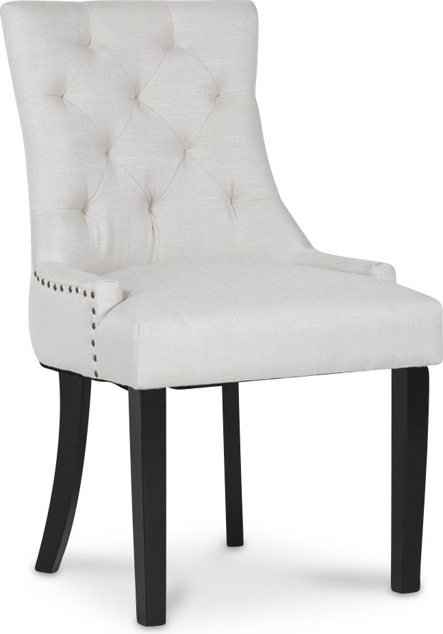 Eastport matstol klädd i ett klassiskt slitstarkt beige linneliknande tyg samt mörkbruna ben. Stolen pryds av antikfärgade nitarna längst med ryggens kant. Stolen är välarbetad och en av våra mest populära stilar.