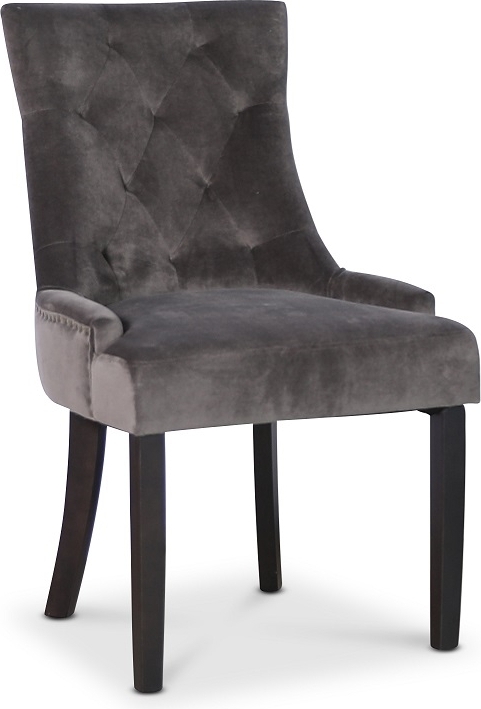 Elegant stol i grå velour med mörkbruna ben. Stolen har antikfärgade spik som dekoration längs stolsryggen.