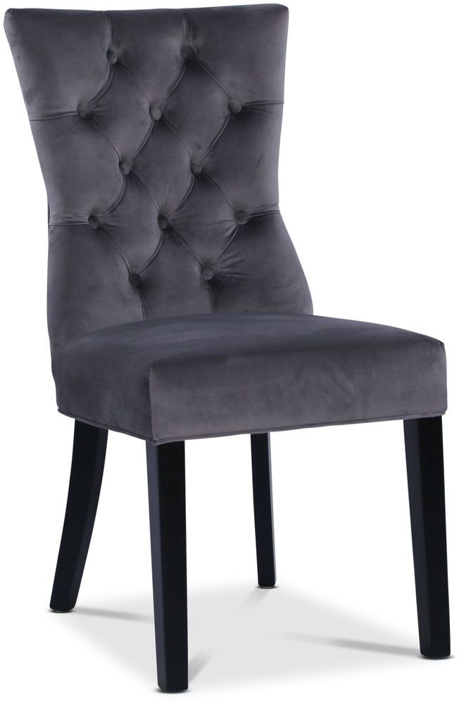Tuva Kate - Är den mest lyxiga i serien Tuva med hög rygg. Grått sammetstyg och ringhandtag på ryggen som snygg detalj! Stolen är välarbetad med ben i antikt utförande. Kate är en av våra mest populära matstolar i Vintage-stil! Modellen levereras hem till kund i färdigmonterat skick.