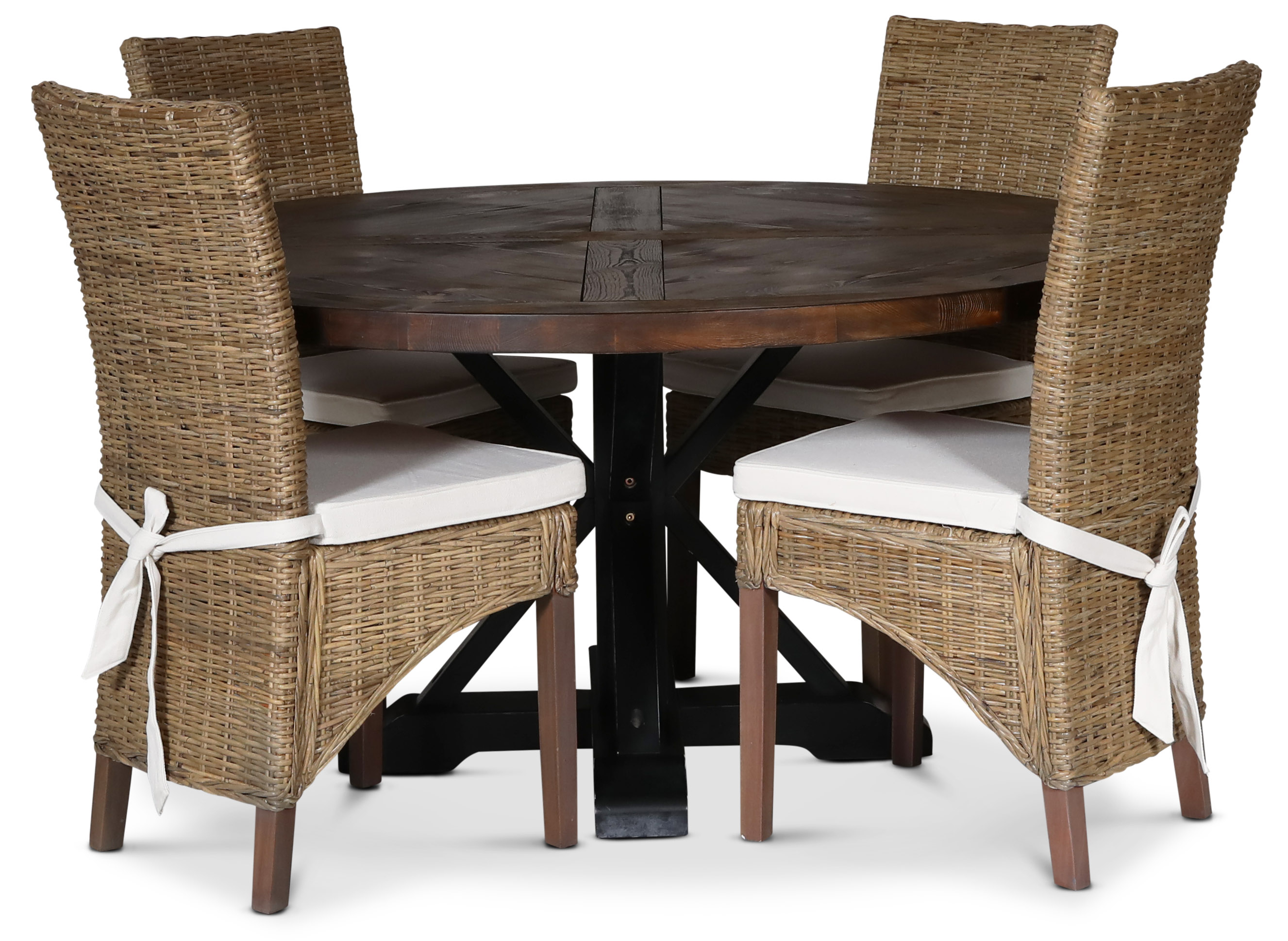 Tuva matgrupp från Skånska Möbelhuset, runt matbord, i brunlaserad drivved med svart underrede. Fyra stycken Croco matstolar i rotting med tillhörande dyna.