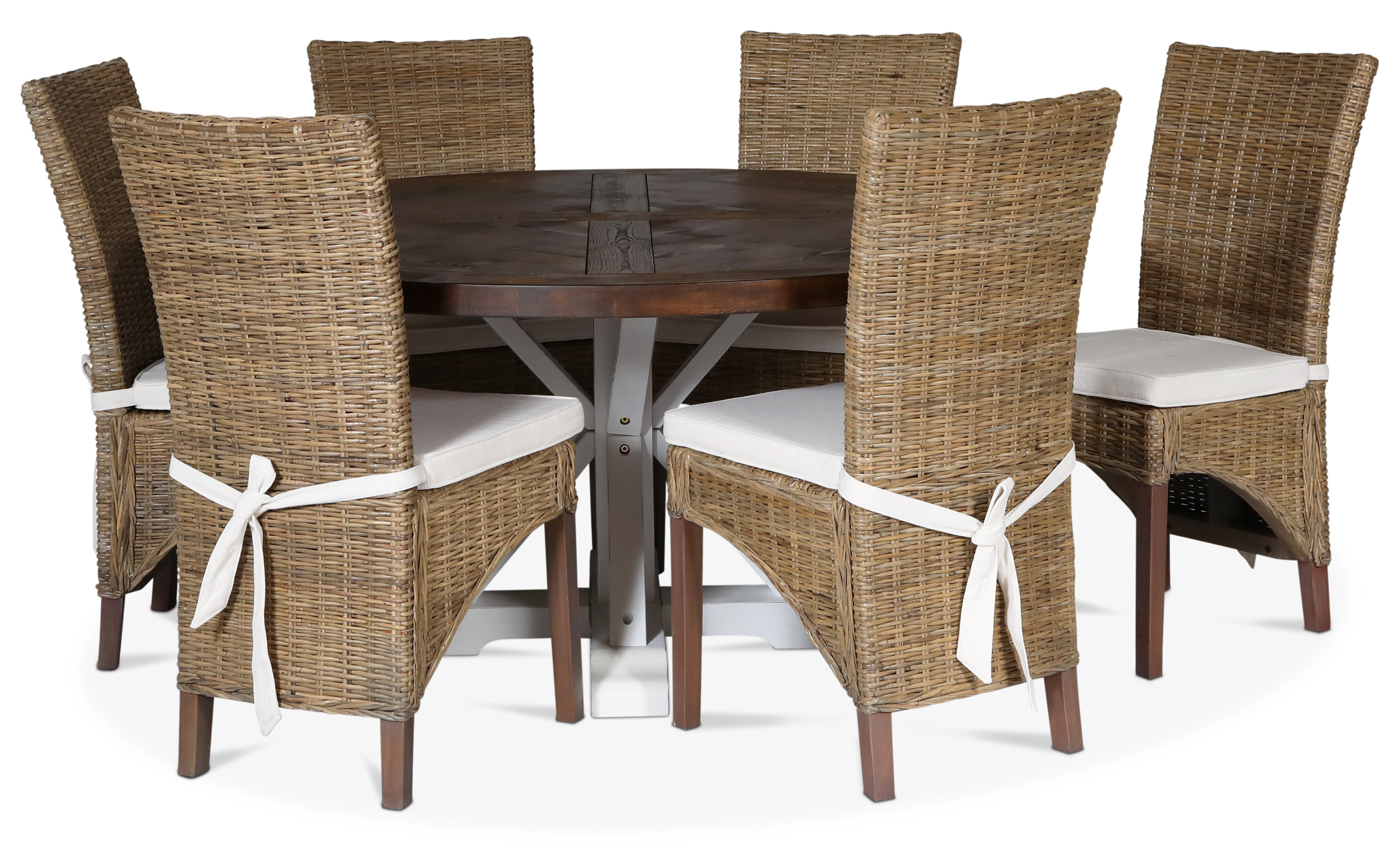 Tuva matgrupp från Skånska Möbelhuset, runt matbord, i brunlaserad drivved med vitt underrede. Sex stycken Croco matstolar i rotting med tillhörande dyna.