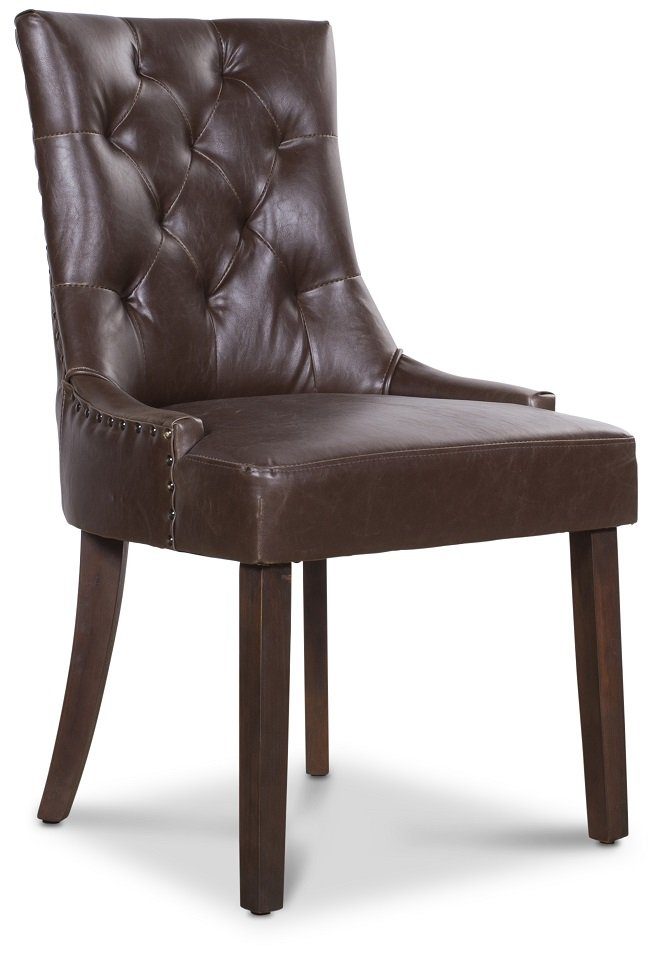 Tuva New Port stol klädd i ett brunt PU med vintageutseende och bruna ben. Stolen pryds av antikfärgade nitarna som en snygg detalj! Stolen är välarbetad och en av våra mest populära matstolar.