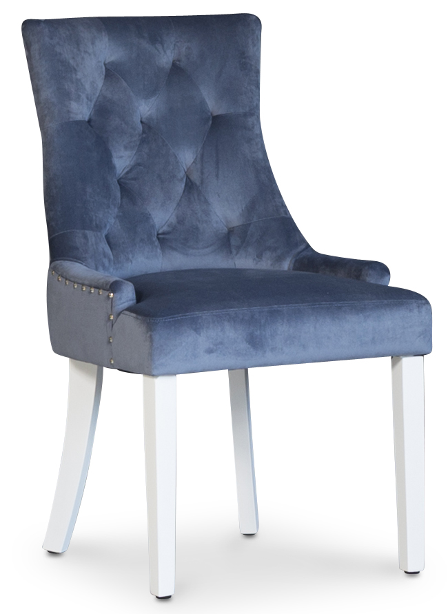Tuva stol klädd i ett mjukt och lent sammetsliknande Navyblå sammet med vitlackade ben. Stolen pryds av kromade nitarna och handtag i ryggen som en snygg detalj! Stolen är välarbetad och en av våra mest populära matstolar.