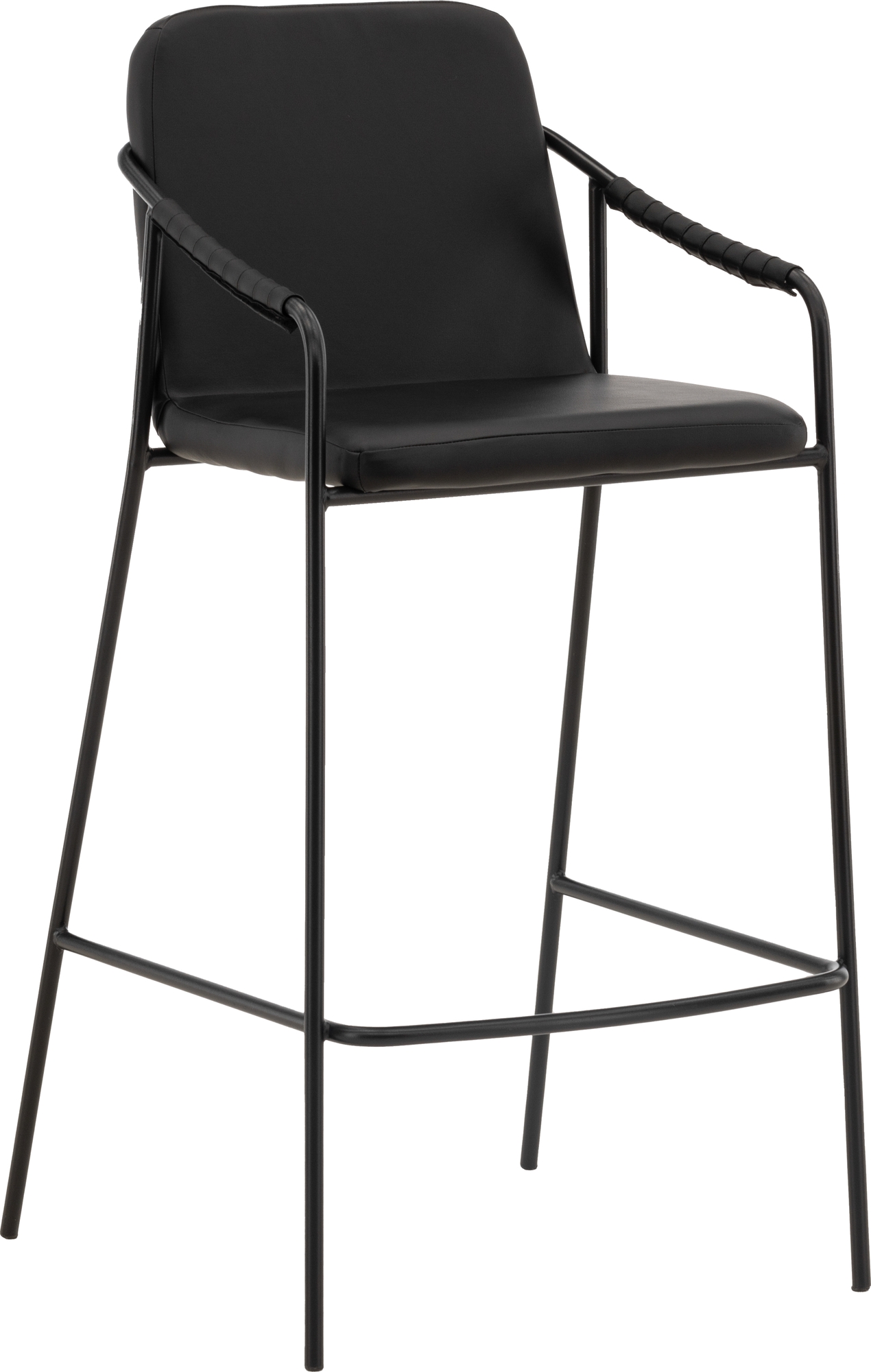 Modern barstol som passar utmärkt i det moderna hemmet! Den här barstolen har en stoppad sits och helklädd design i svart PU med minimalistiska stolsben samt integrerade armstöd i svart stål. Placera intill bardisken eller ditt barbord och ta dina måltider till nya höjder med en barstol som snabbt skapar ett snyggt blickfång i ditt hem!