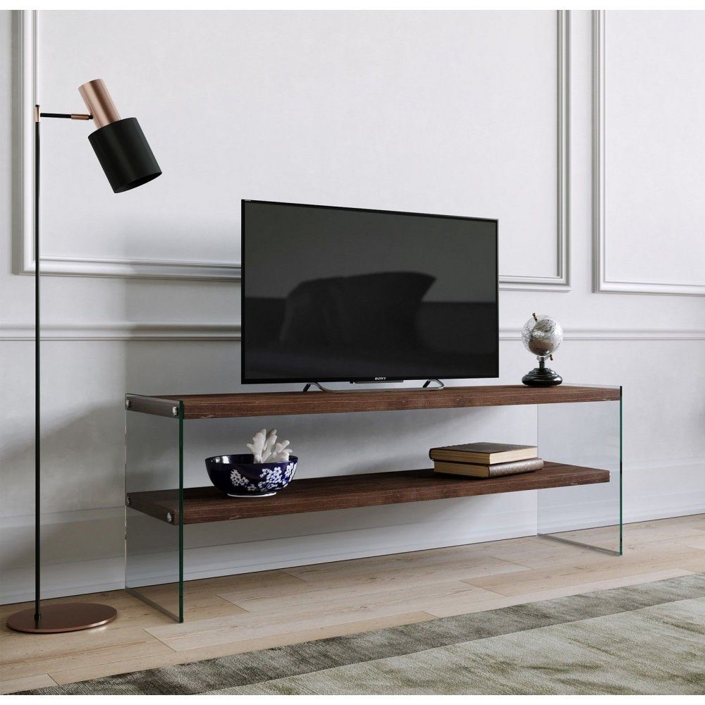 Mediabänk av trä och tempererat glas.