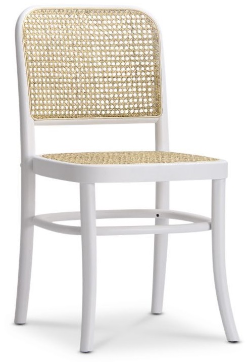 Tyko stol med stomme av massiv bok i vitt utförande, sits- och rygg av naturfärgad rotting. En snygg kombination som passar det moderna hemmet.