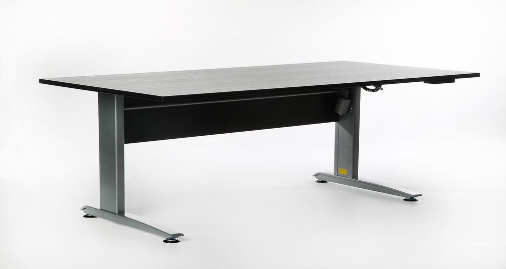 Ett fint skrivbord med en modern design. Underredet är tillverkat av grå metall och bordsskivan är av MDF med svart melamin. Bordet är höj- och sänkbart.