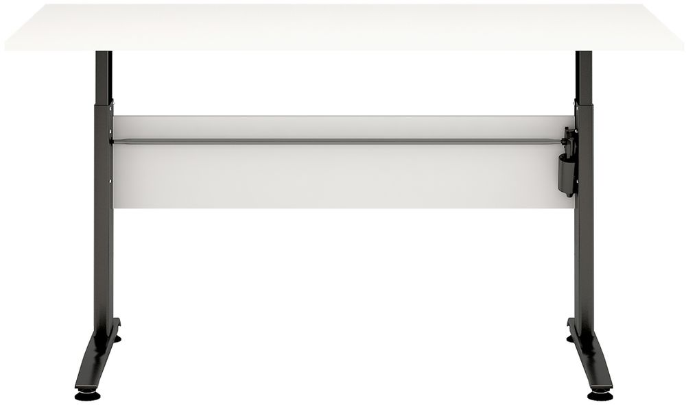 Ett fint skrivbord med en modern design. Underredet är tillverkat av Grå metall och bordsskivan är av MDF med vit melamin. Bordet är höj- och sänkbart.
