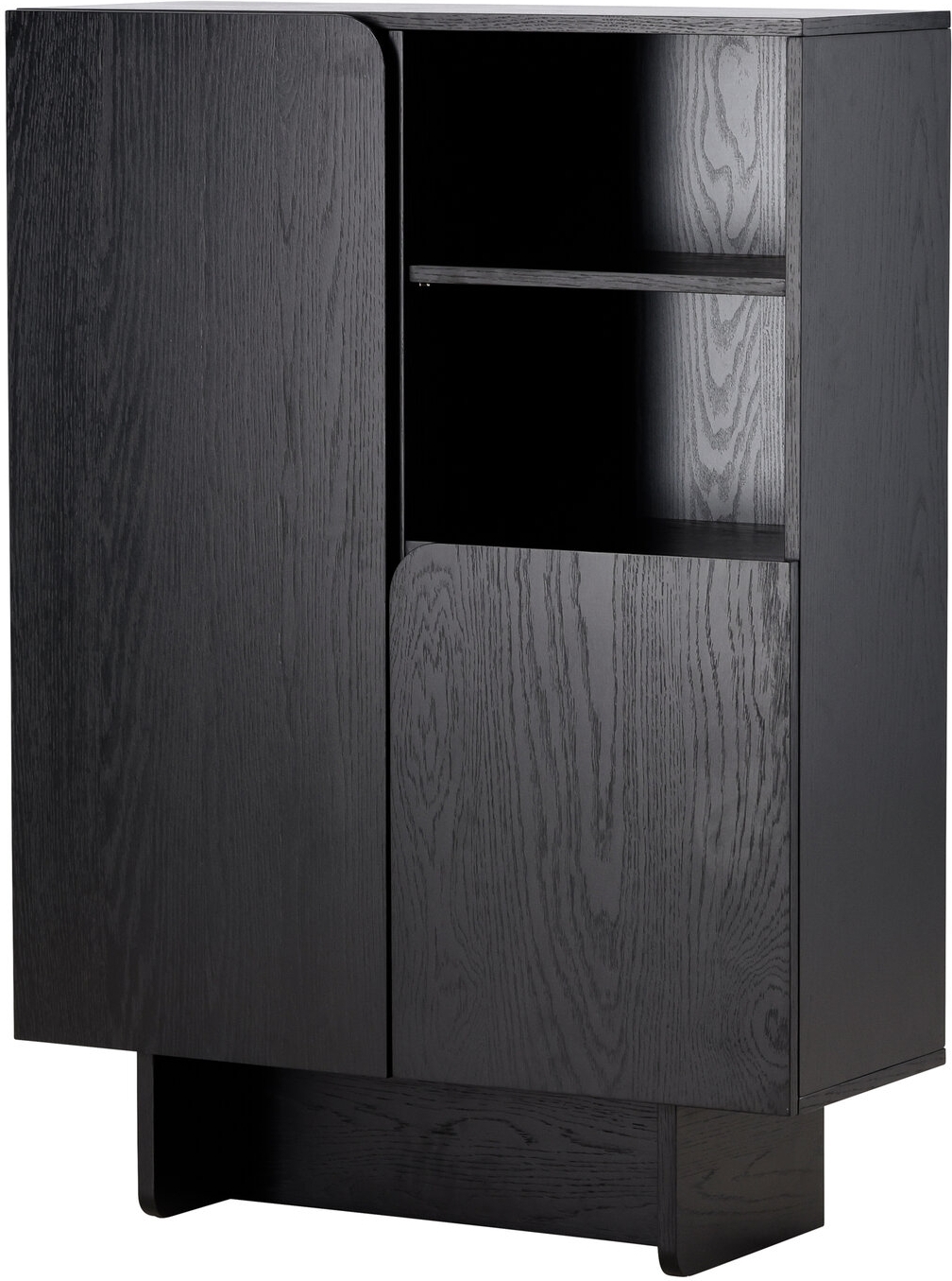 Skåp som är en perfekt blandning av modern design och praktisk funktionalitet, utformat för att tillföra både stil och förvaring till ditt hem. Tillverkat i robust MDF och lackerat i en elegant svart finish, ger detta skåp ett sofistikerat och samtida uttryck som enkelt smälter in i alla inredningar. Skåpet erbjuder gott om förvaringsutrymme utan att ta upp för mycket golvyta. Detta gör det idealiskt för både mindre lägenheter och större rum där effektiv användning av utrymme är viktigt. Skåpets rymliga inre är perfekt för att förvara allt från böcker och dekorativa föremål till köksutrustning och personliga tillhörigheter. Den svarta MDF-konstruktionen säkerställer hållbarhet och långvarig kvalitet, samtidigt som den ger en ren och polerad yta som är lätt att underhålla. Dörrarna öppnas smidigt för enkel åtkomst till dina förvarade föremål, och de diskreta handtagen kompletterar den minimalistiska designen. Skåpet är inte bara en praktisk förvaringslösning, utan också ett stilrent tillägg till ditt hem. Dess eleganta svarta färg och moderna design gör det till en iögonfallande möbel som kan placeras i vardagsrummet, sovrummet, hallen eller köket för att höja rummet med både funktion och estetik. Låt skåpet bli en del av ditt hem och njut av en perfekt kombination av form och funktion. Med sitt stilfulla utseende och praktiska förvaring är det en investering i både ditt hems utseende och din vardagliga bekvämlighet.