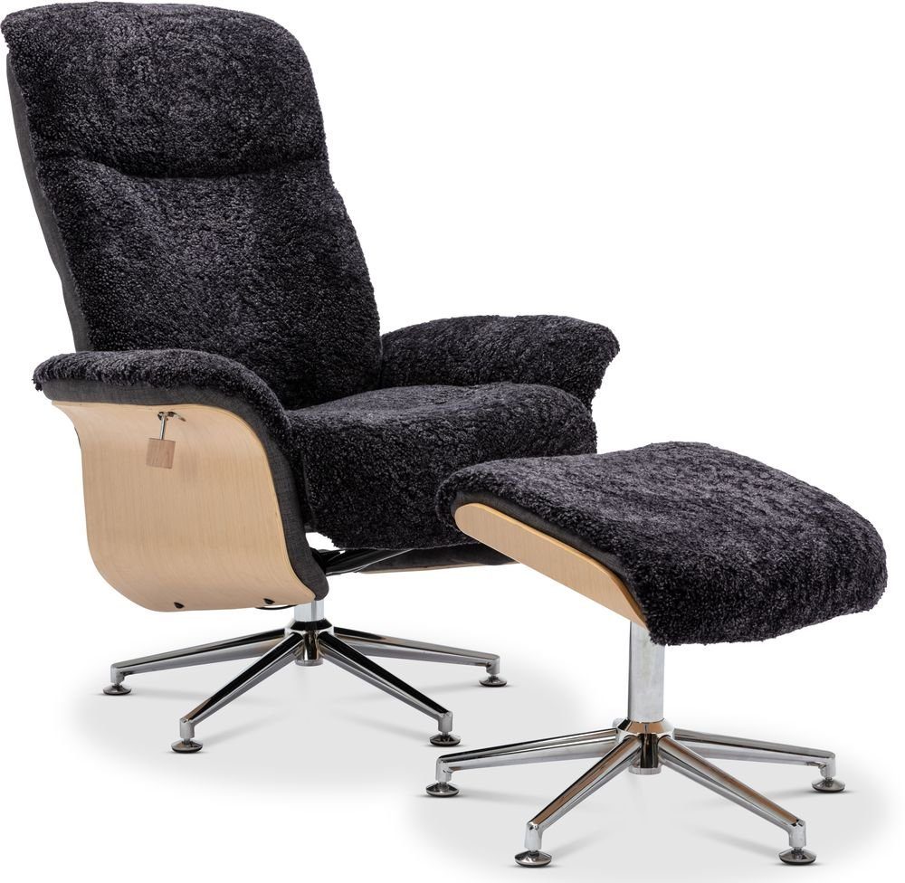 Här i antracitfärgat fårskinn med trä på sidorna i vitpigmenterat ekutförande samt stativ i kromad metall för att återge ett exklusivt utseende och känsla. Recliner funktionen går att ställa och låsa i olika ställningar. Matchande fotpall ingår.