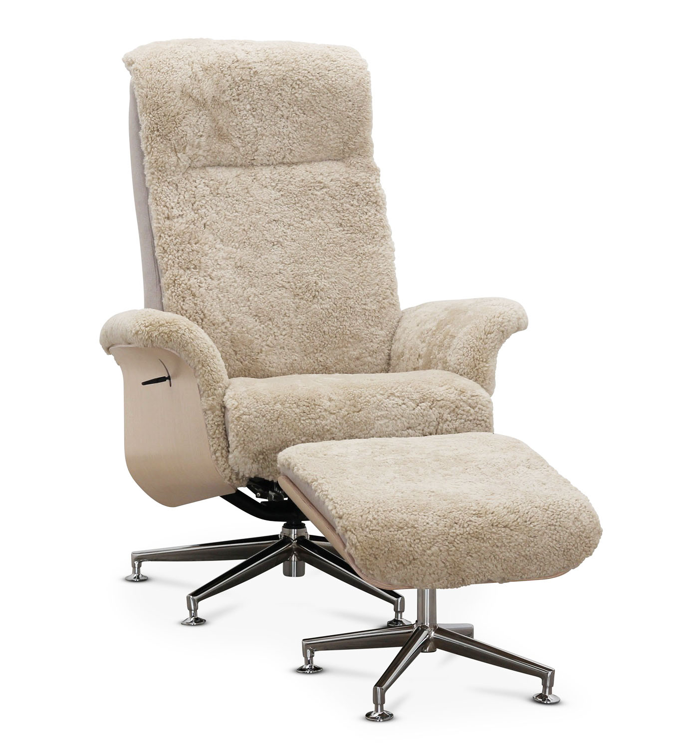 Ulla är utrustad med en reclinerfunktion som kan justeras och låsas i olika lägen, detta gör att du enkelt kan hitta den perfekta positionen för avkoppling. Den medföljande fotpallen i matchande fårskinn höjer komforten yttligare och tillsammans med fåtöljen blir Ulla en perfekt kombination med moderna funktioner.