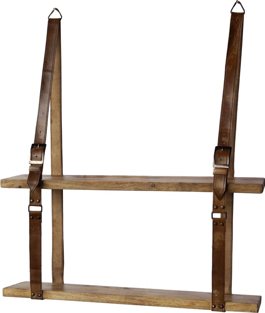 Vägghylla bestående av två hyllplan i mangoträd, upphängda på två skärp-liknande läderremmar. En annorlunda hylla som sätter en personlig prägel på inredningen. Varje hylla är unik och kan därför skilja i finish.