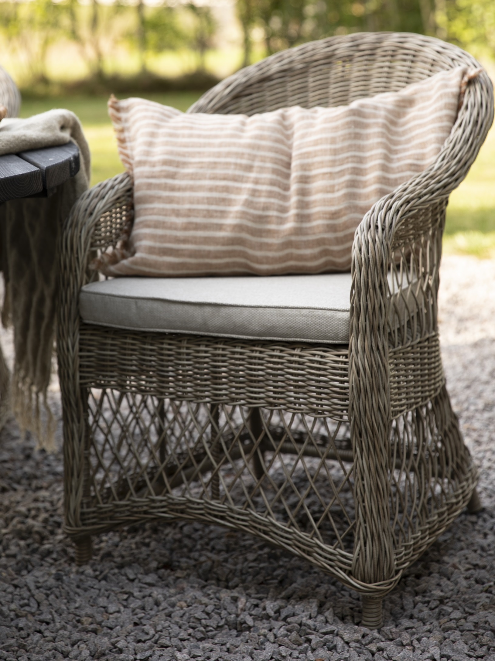 Den naturliga färgen på konstrottingen ger en varm och inbjudande känsla som harmoniserar med alla typer av miljöer, från moderna till mer klassiska utomhusmiljöer. Marbella fåtölj är perfekt för trädgården, terrassen eller balkongen.
