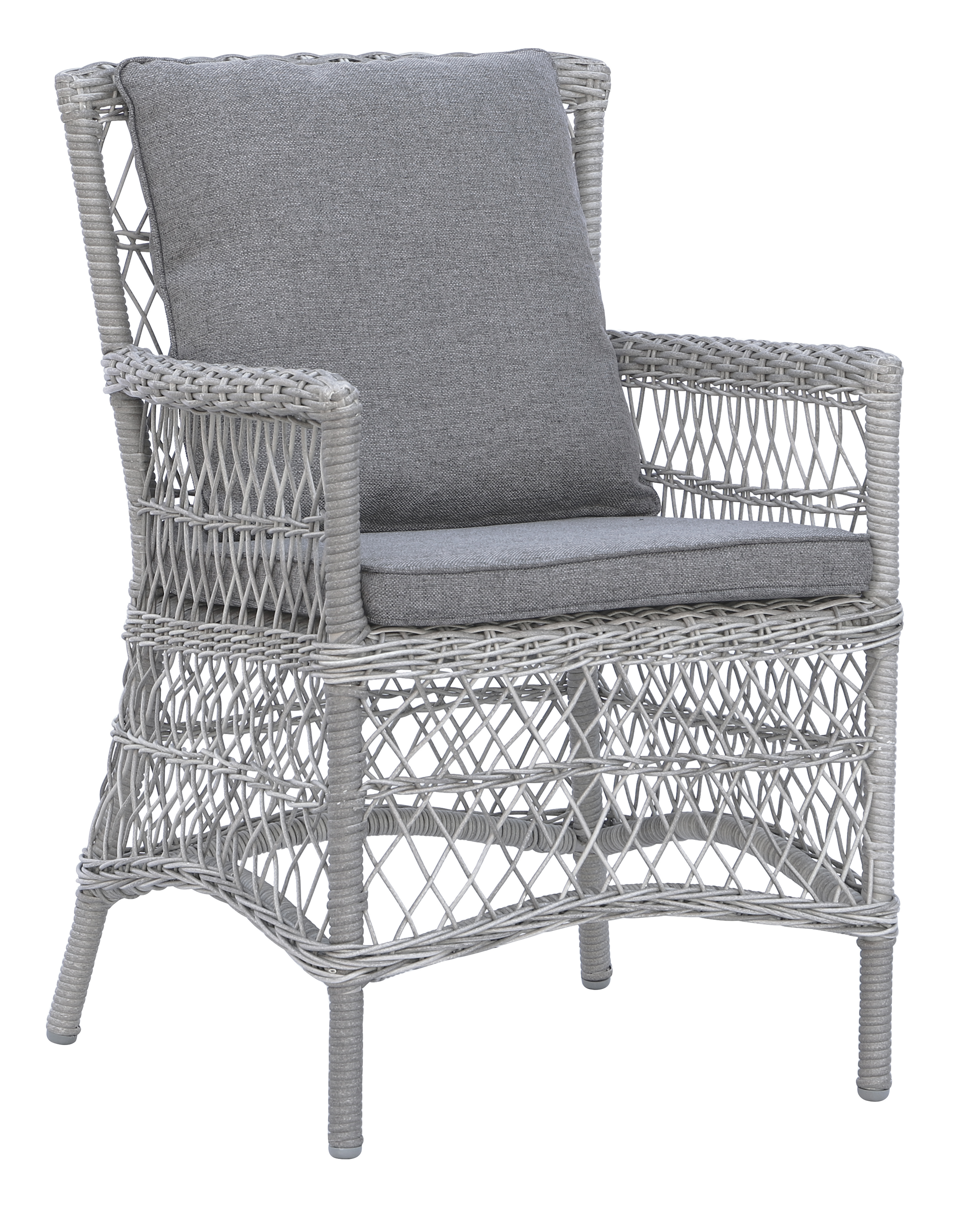 Matgruppen består av ett runt bord med stilren glasskiva och en robust aluminiumstomme i grå konstrotting, som passar både ute- och inomhusmiljöer. Till bordet hör bekväma sommarstolar med en luftig design i grå plastrotting och aluminium, utrustade med både rygg- och sittdyna för extra komfort. Bordet är från Jacksonville-serien och stolarna tillhör Provence-serien.