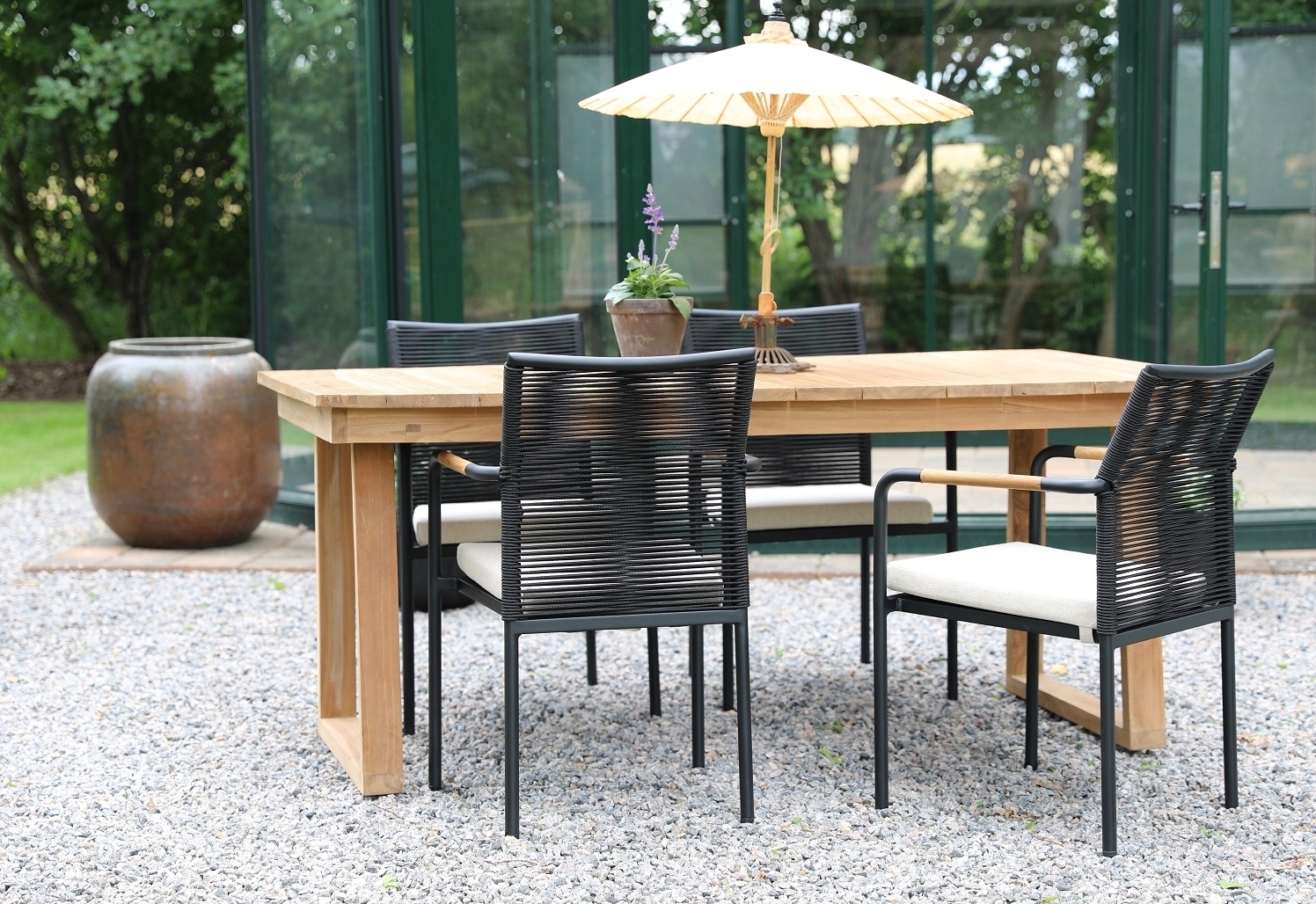 Saltö matgrupp för uteplatsen med ett rektangulärt matbord i massiv teak, tillsammans med Skanör karmstol i svart och teak med en beige skön sittdyna. En modern kombination på uteplatsen.