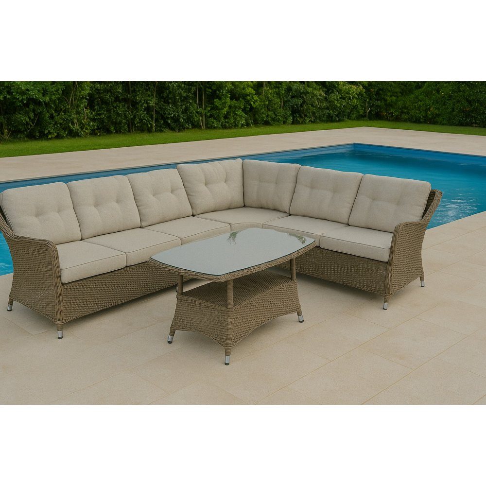 Vinga är en stor hörnsoffgrupp som tillsammans med ett matchande bord skapar en inbjudande plats för avkoppling och umgänge utomhus. Gruppen är tillverkad i naturfärgad konstrotting, vilket ger ett tidlöst och mjukt uttryck som passar i de flesta utemiljöer. Soffan har tjocka, bekväma dynor i beige vädertåligt tyg, som ger både komfort och en stilren helhet. Bordet har en tålig yta i tempererat glas som är lätt att hålla ren.