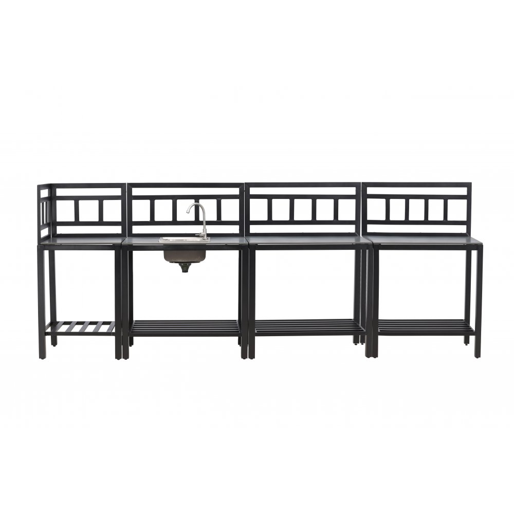 Helheten består av fem moduler: två arbetsbänkar, en bänk med förborrat hål för diskho, en hörnmodul samt en diskho i rostfritt stål med blandare och avlopp. Kombinationen skapar en generös och praktisk arbetsyta som enkelt anpassas efter plats och behov. Alla delar har en stabil stomme i svartlackerad aluminium och slitstarka skivor i grå sten, vilket ger både hållbarhet och ett stilrent uttryck.