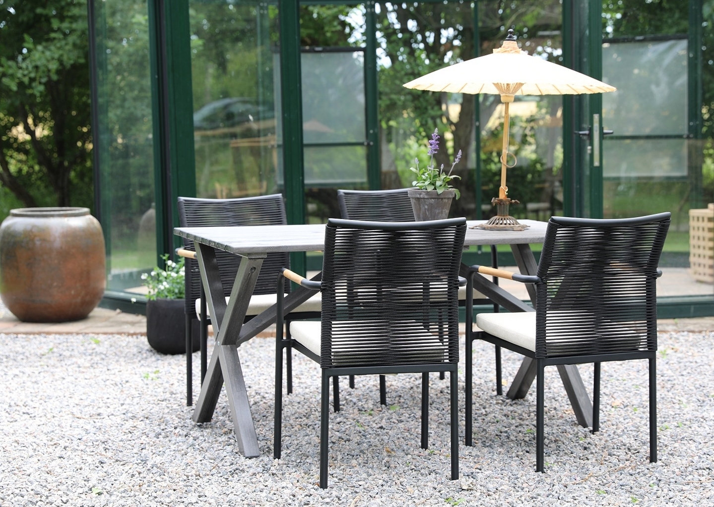 Scottsdale matgrupp för uteplatsen med ett rektangulärt robust matbord, tillsammans med Skanör karmstol med svart rygg i rep och en beige skön sittdyna. Bordet är tillverkat i grålaserad furu vilket gör utegruppen väderbeständig och tålig för att klara uteplatsens miljö.