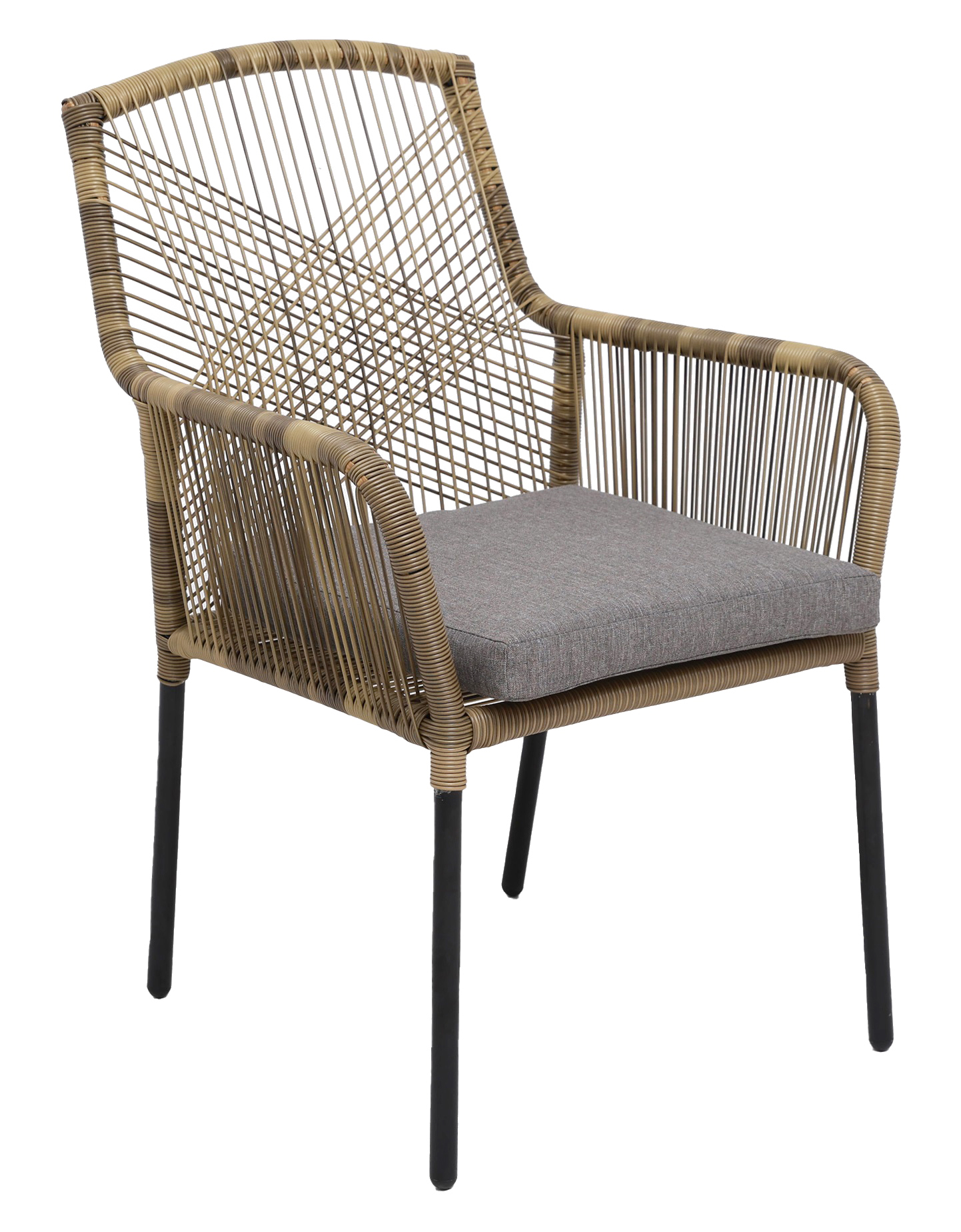 Scottsdale matgrupp för uteplatsen med ett rektangulärt robust matbord, tillsammans med Ystad karmstol med beige tvinnad konstrotting och en grå skön sittdyna. Bordet är tillverkad i svartlaserad furu vilket gör utegruppen väderbeständig och tålig för att klara uteplatsens miljö.