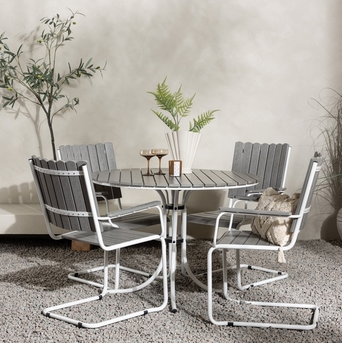 Bordet har en stabil stomme i vitlackad metall och en topp i grå aintwood, vilket gör det underhållsfritt och tåligt för daglig användning. Stolarna har en ergonomisk design med svikt, vilket gör dem lika bekväma som de är estetiskt tilltalande. Den genomtänkta designen och de högkvalitativa materialen gör Holmsund matgrupp till ett tidlöst tillskott i ditt hem.