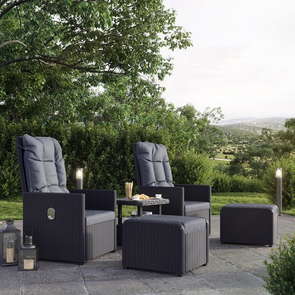 Utemöbelgrupp med 2 ställbara fåtöljer, bord och 2 stycken pallar.