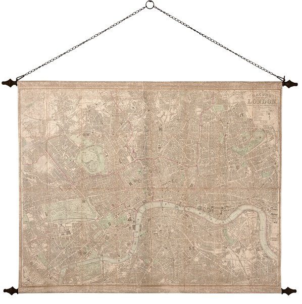 En stor och vacker väggdekoration med stadskarta över London som motiv. Tillverkad på canvas som är fäst i två ramar och rullas ut till en tavla.
