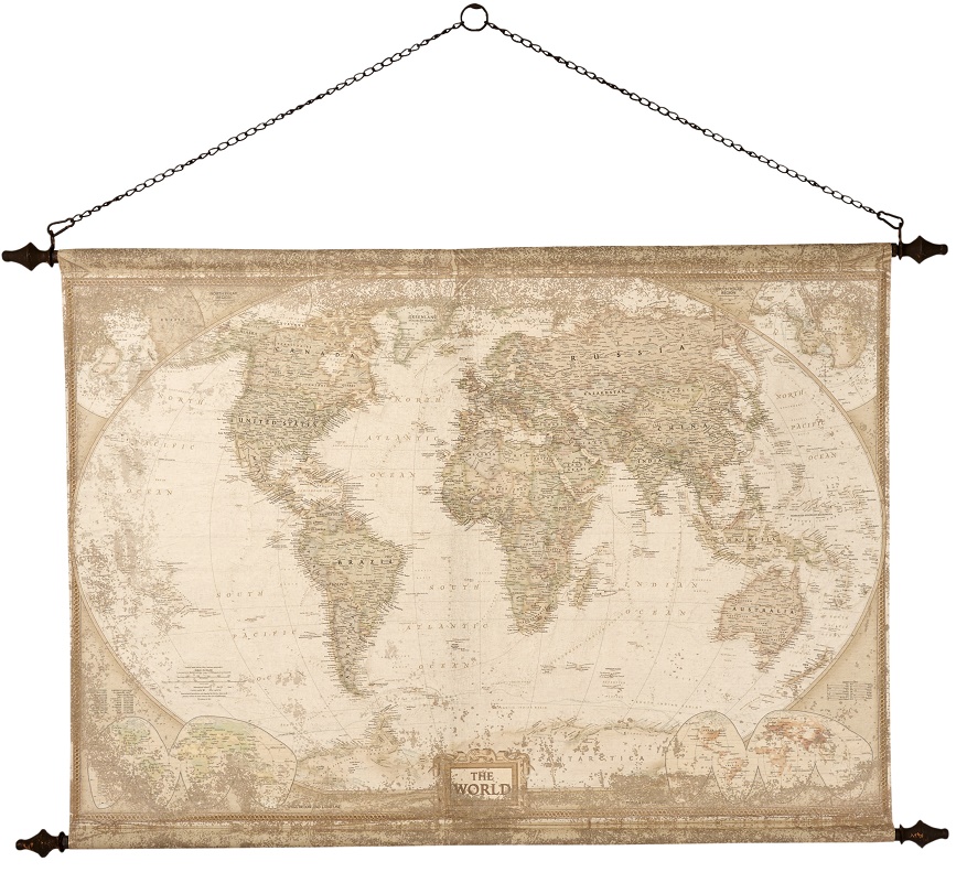 En stor och vacker väggdekoration med världskartan som motiv. Tillverkad på canvas som är fäst i två ramar och rullas ut till en tavla.