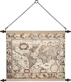 En vacker väggdekoration med världskarta som motiv. Tillverkad på canvas som är fäst i två träramar och rullas ut till en tavla.