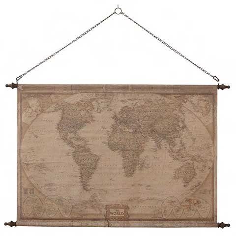 En stor och vacker väggdekoration med världskarta som motiv. Tillverkad på canvas som är fäst i två ramar och rullas ut till en tavla.