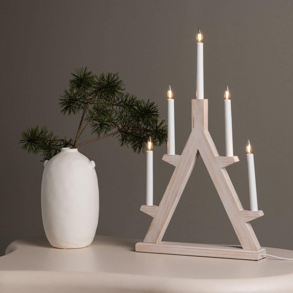Ge ditt hem en touch av nordisk charm med Val Thorens adventsljusstake. Denna vackra adventsljusstake är tillverkad i vitvättad tall och erbjuder en naturlig och rustik tolkning av den traditionella adventsdekorationen. Med fem inkluderade lampor sprider den en varm och inbjudande glöd som skapar en atmosfär av förväntan inför julen. Den vitvättade tallen ger en subtil och naturlig känsla till din inredning och skapar en lugnande atmosfär i ditt hem. Placera den på din matsalsbord, en hylla eller som en central del av din juldekoration för att lysa upp ditt hem under hela julperioden. Med Val Thorens adventsljusstake kan du skapa minnesvärda stunder och njuta av jultraditioner med en enkel och naturlig touch. Låt den bli en viktig del av din jul och skapa varaktiga minnen för kommande år.