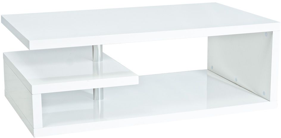 Ett snyggt soffbord med en modern design. Bordet är tillverkad av vitlackerad MDF med detaljer i kromad metall. Praktiska hyllplan under toppskivan för smart förvaring.
