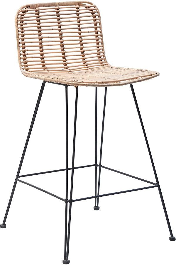En fin barstol med en retro design. Underredet är tillverkat av svart metall med ett praktiskt fotstöd och sitsen , samt ryggstödet är av naturlig rotting.