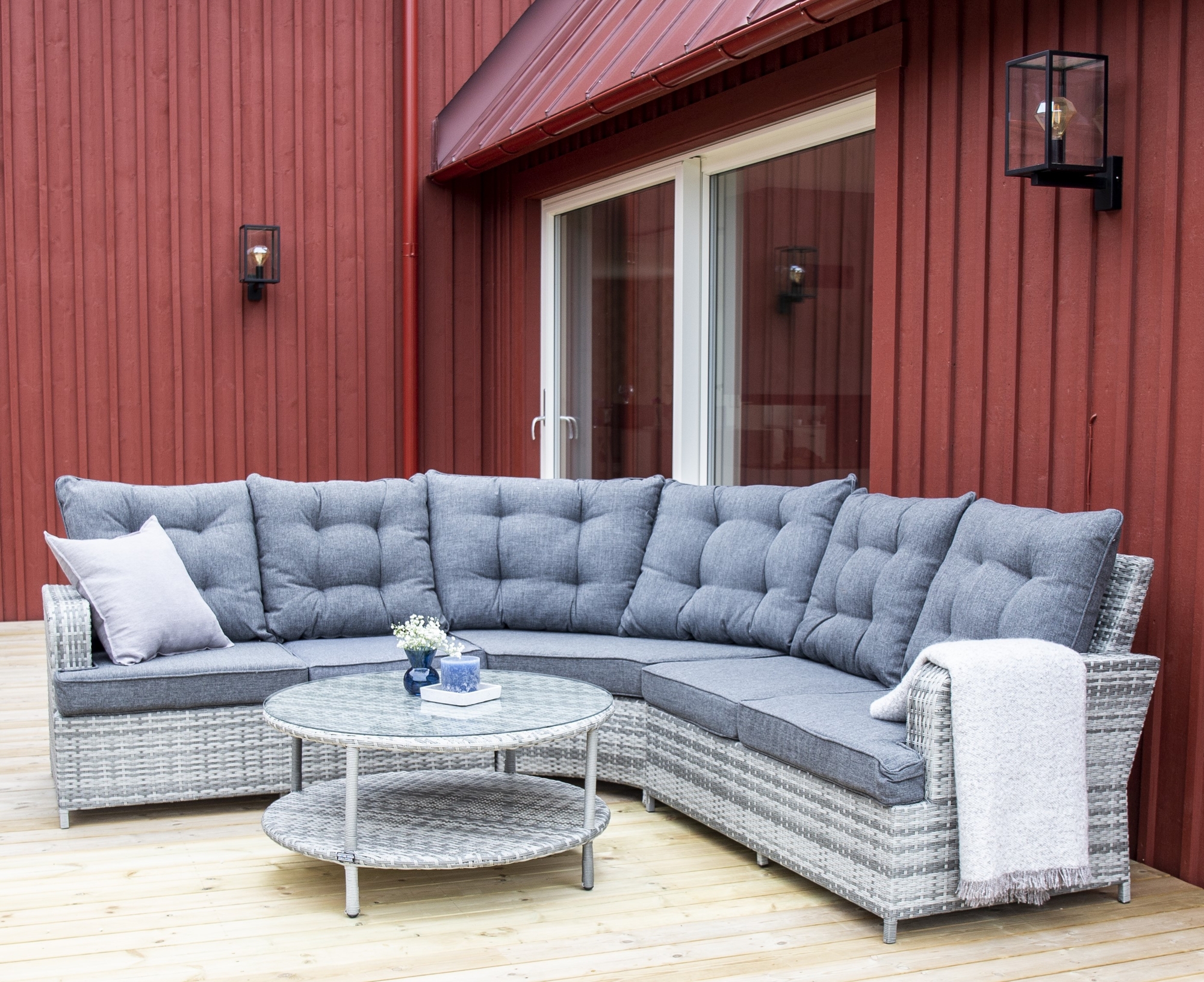 Exklusivt loungeset för sköna stunder på din uteplats. Soffgruppen består av en hörnsoffa med 5 sittplatser och en rundad hörndel. Inklusive mörkgrå mjuka dynor samt ett lägre runt soffbord med en avlastningshylla och bordsskiva av glas. Tillverkat av en metallstomme och ljusgrå konstrotting.