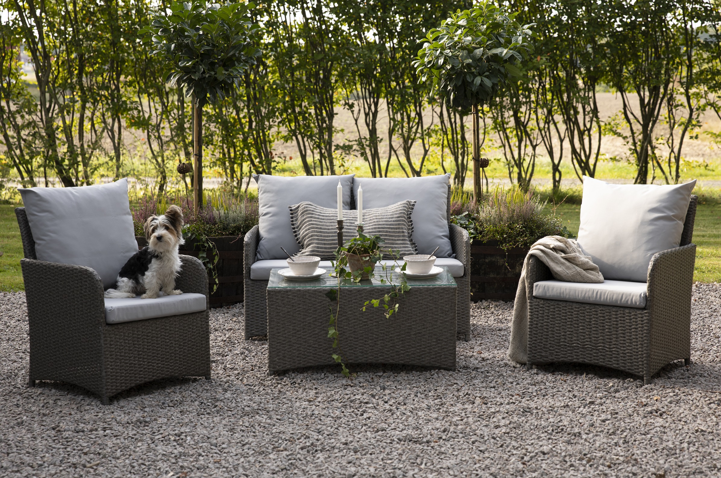 Valencia loungegrupp i konstrotting med grå dynor
