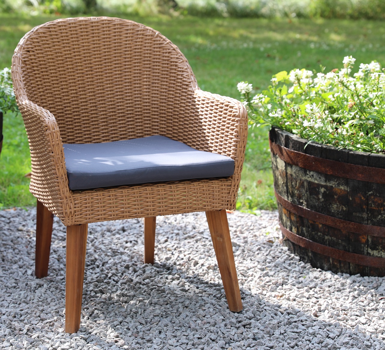 Matstol Valetta i konstrotting med bruna ben från Skånska Möbelhuset. Utestolen har ljusbrun konstrotting med matchande grå sittdyna. Perfekt till bordet på uteplatsen eller i uterummet.