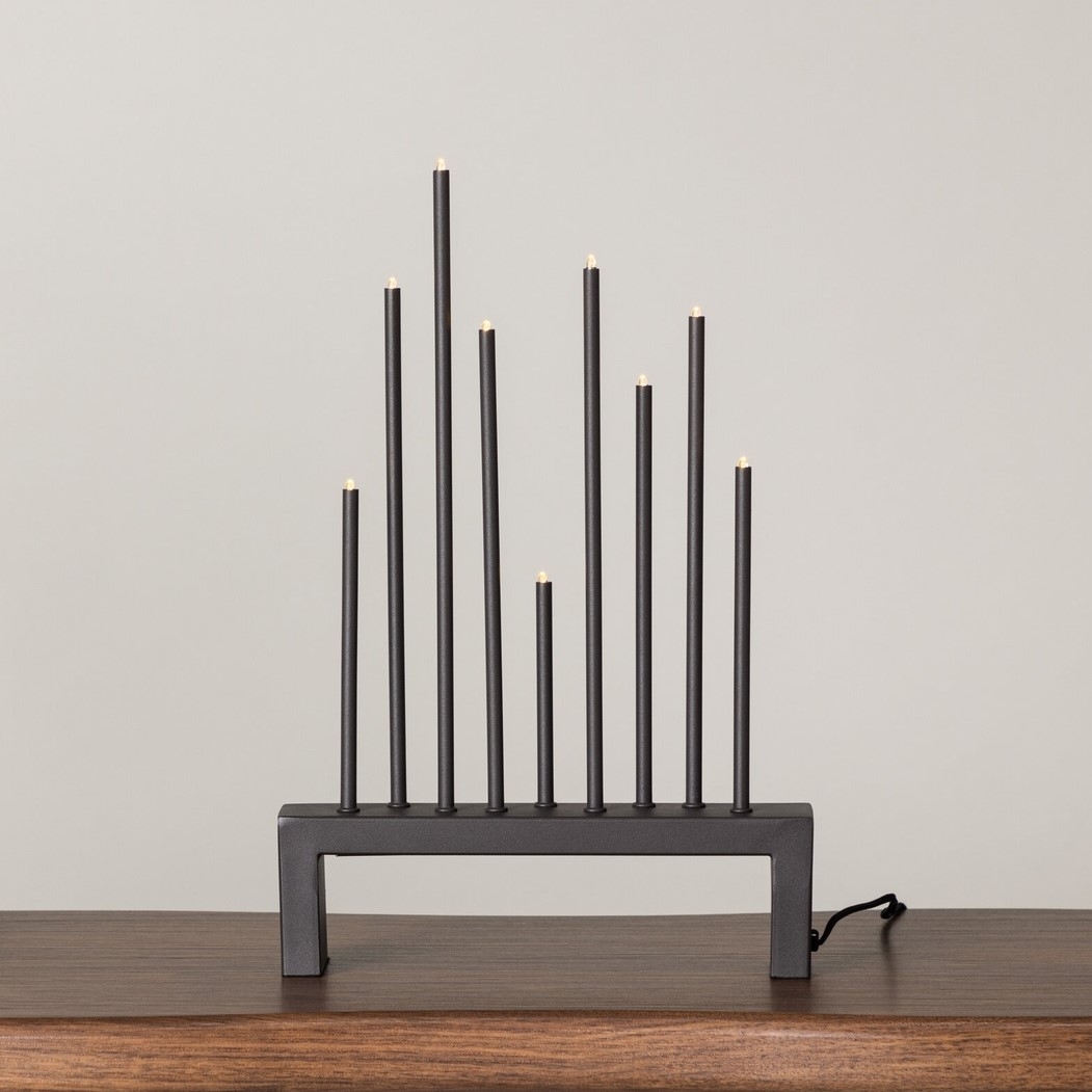 Skapa en stämningsfull och stilren atmosfär i ditt hem med vår fantastiska bruna adventsljusstake från serien Vallåsen. Denna eleganta bordslampa är utformad som en oregelbunden adventsljusstake och tillverkad i vackert mörkbrunt stål. Med små lampor i olika höjder sprider den ett varmt och inbjudande sken. Vallåsen är inte bara en vanlig adventsljusstake, den är också en stilren detalj. De små lamporna står stolt på ett upphöjt rätblock, vilket ger en modern touch till den traditionella designen. Placera den på ditt skrivbord för att skapa en avkopplande arbetsmiljö eller låt den lysa upp din fönsterkarm och välkomna besökare med sin charmiga glöd. Bäst av allt - den här lampan är inte begränsad till julens firande utan passar utmärkt som lampa hela året om. Den stilrena, jordnära kulören gör den väldigt modern men om du önskar en mer klassisk färg så finns den även i svart, du väljer vad som passar dig och ditt hem bäst! Mått: 42x27x6cm.
