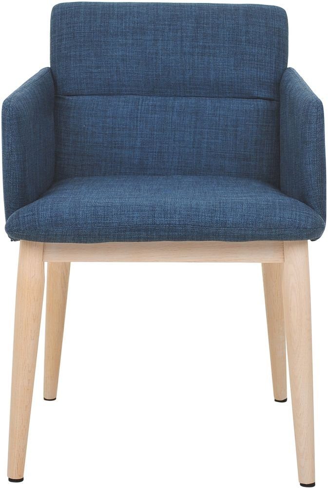 Stilren stol i blått tyg med ben i vitpigmenterad och vaxlackad ek.