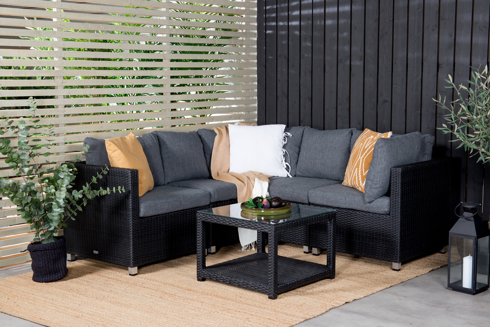 Soffgrupp i modern design till din uteplats eller altan. Soffgruppen består av en hörnsoffa i modulform med fyra sittplatser och en hörndel som går lätt att bygga ihop för att passa dina behov. Inklusive mörkgrå mjuka dynor samt ett lägre soffbord med en avlastningshylla och en bordsskiva av glas. Tillverkat av en metallstomme och svart konstrotting.